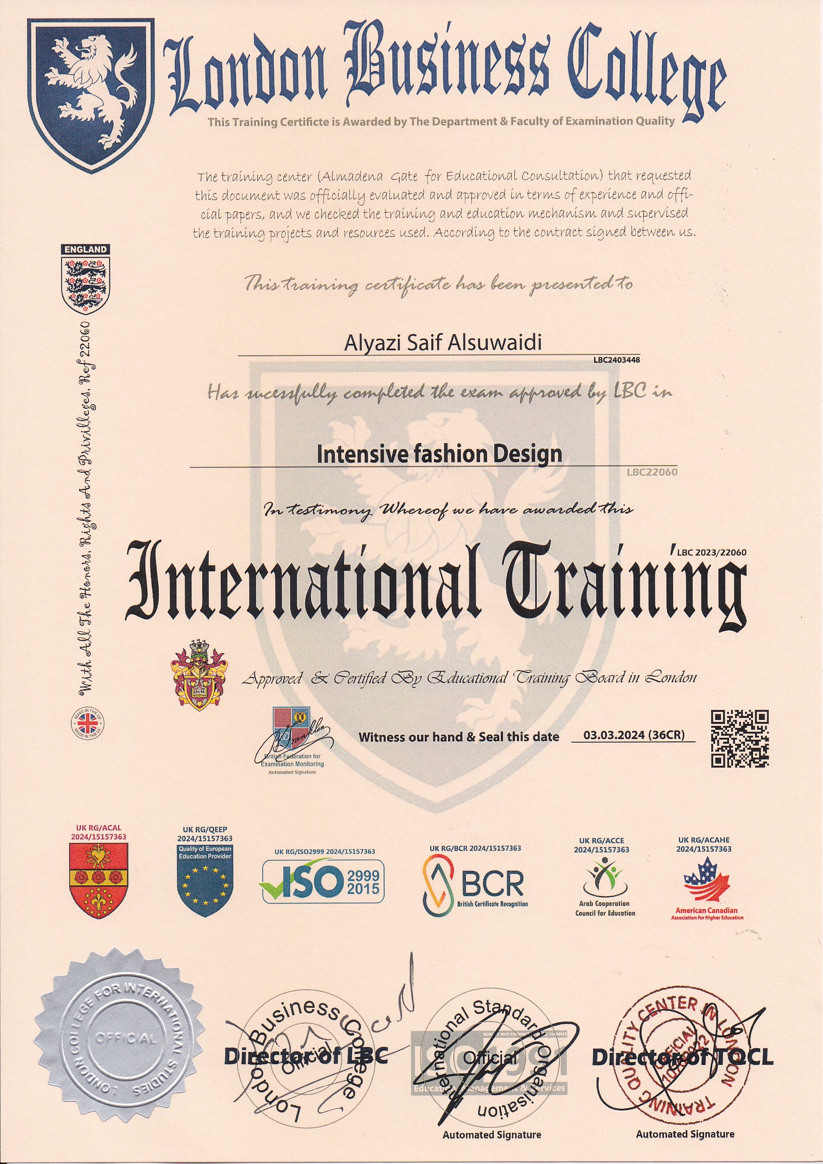 Approved by (Training Quality Center in London)