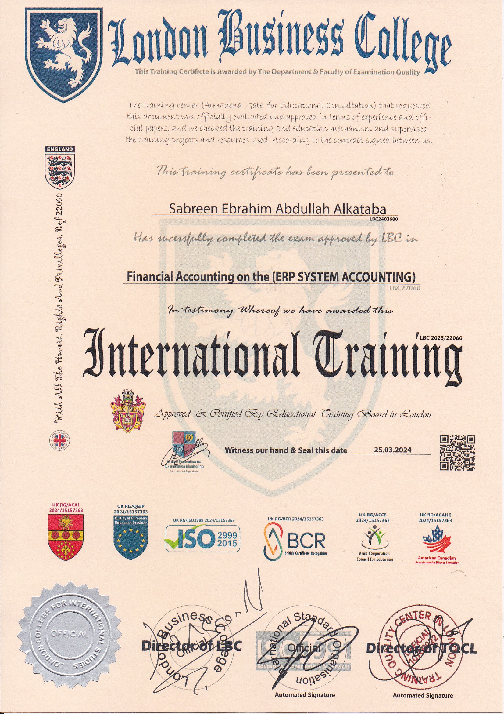 Approved by (Training Quality Center in London)