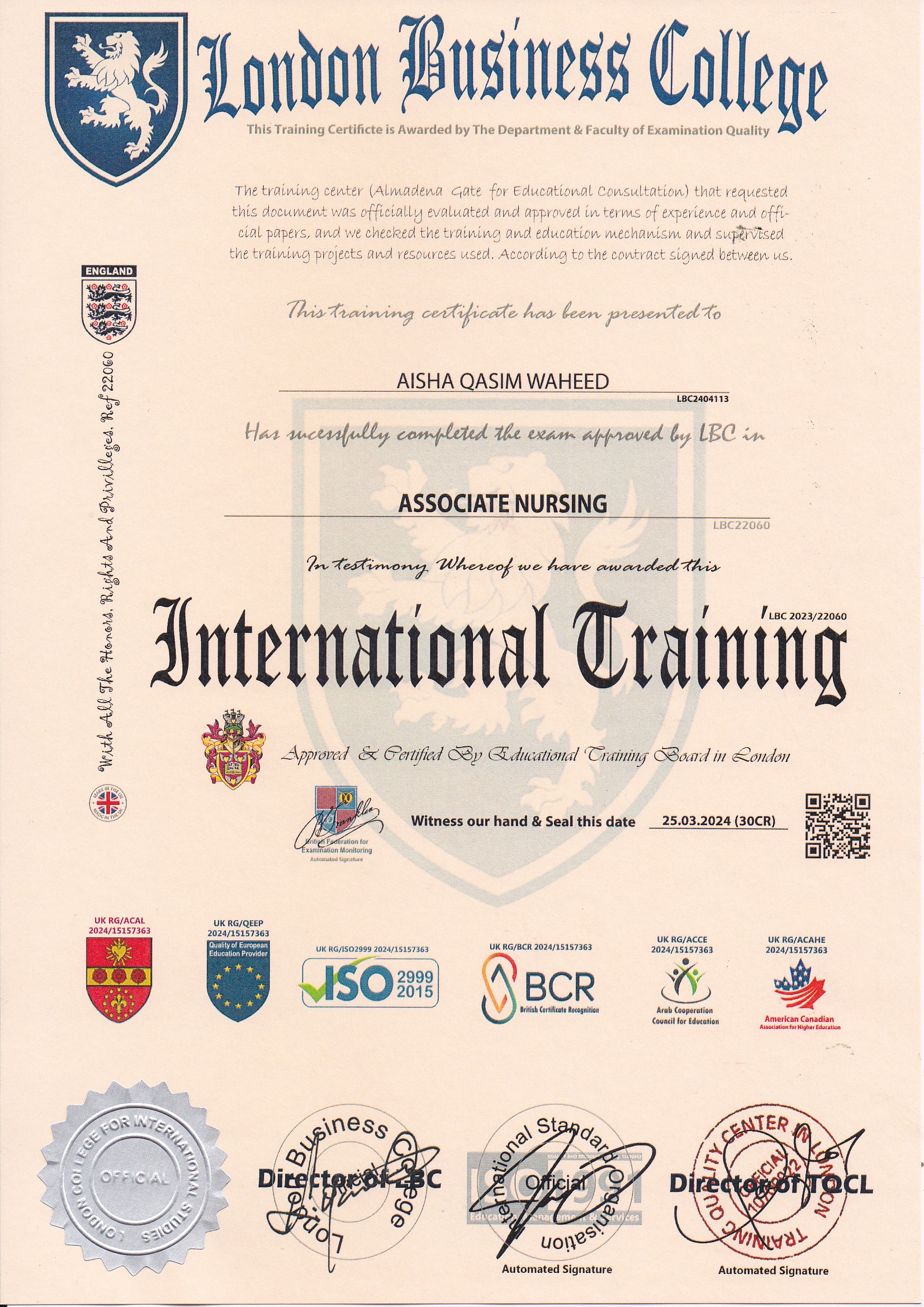 Approved by (Training Quality Center in London)
