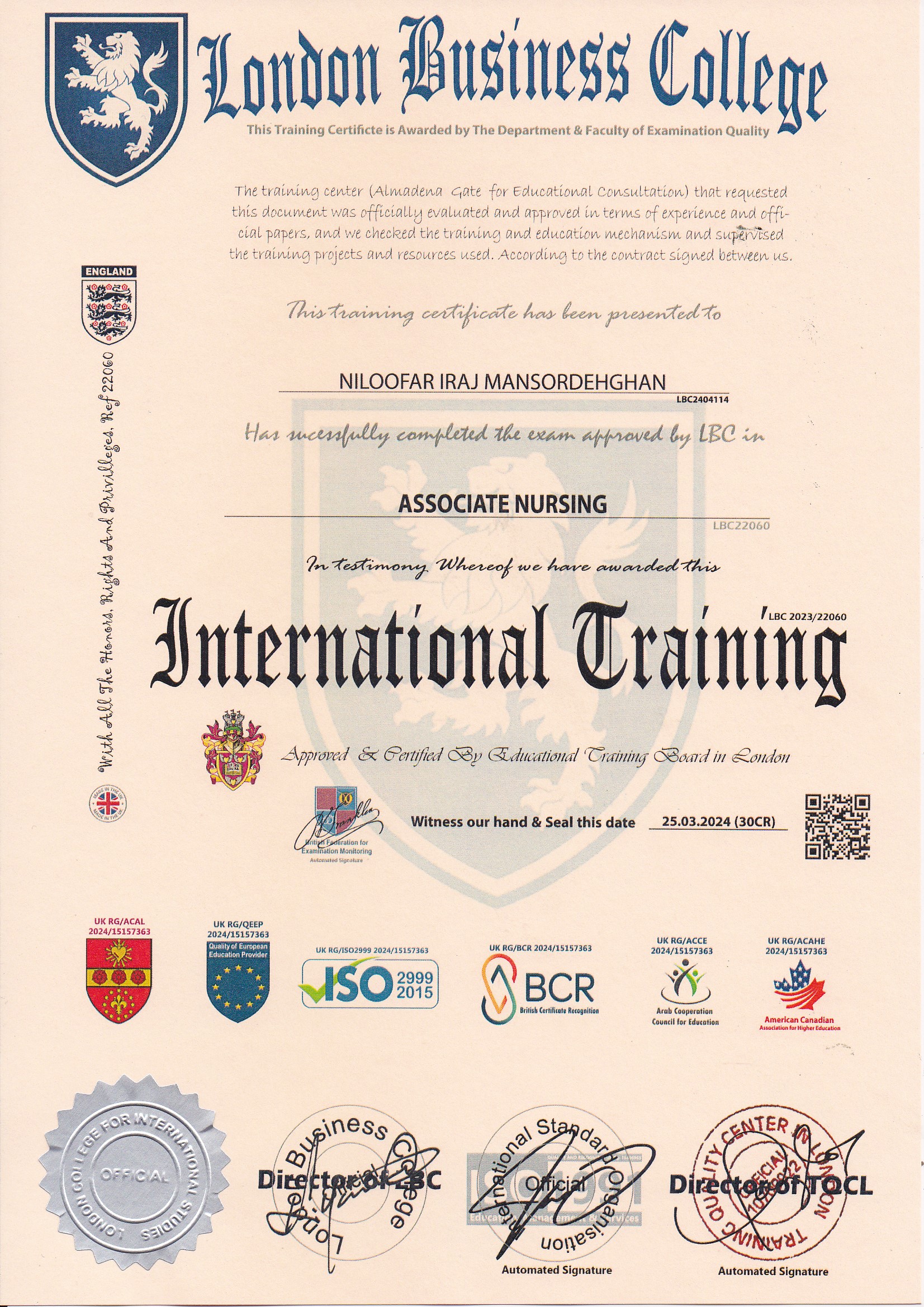 Approved by (Training Quality Center in London)