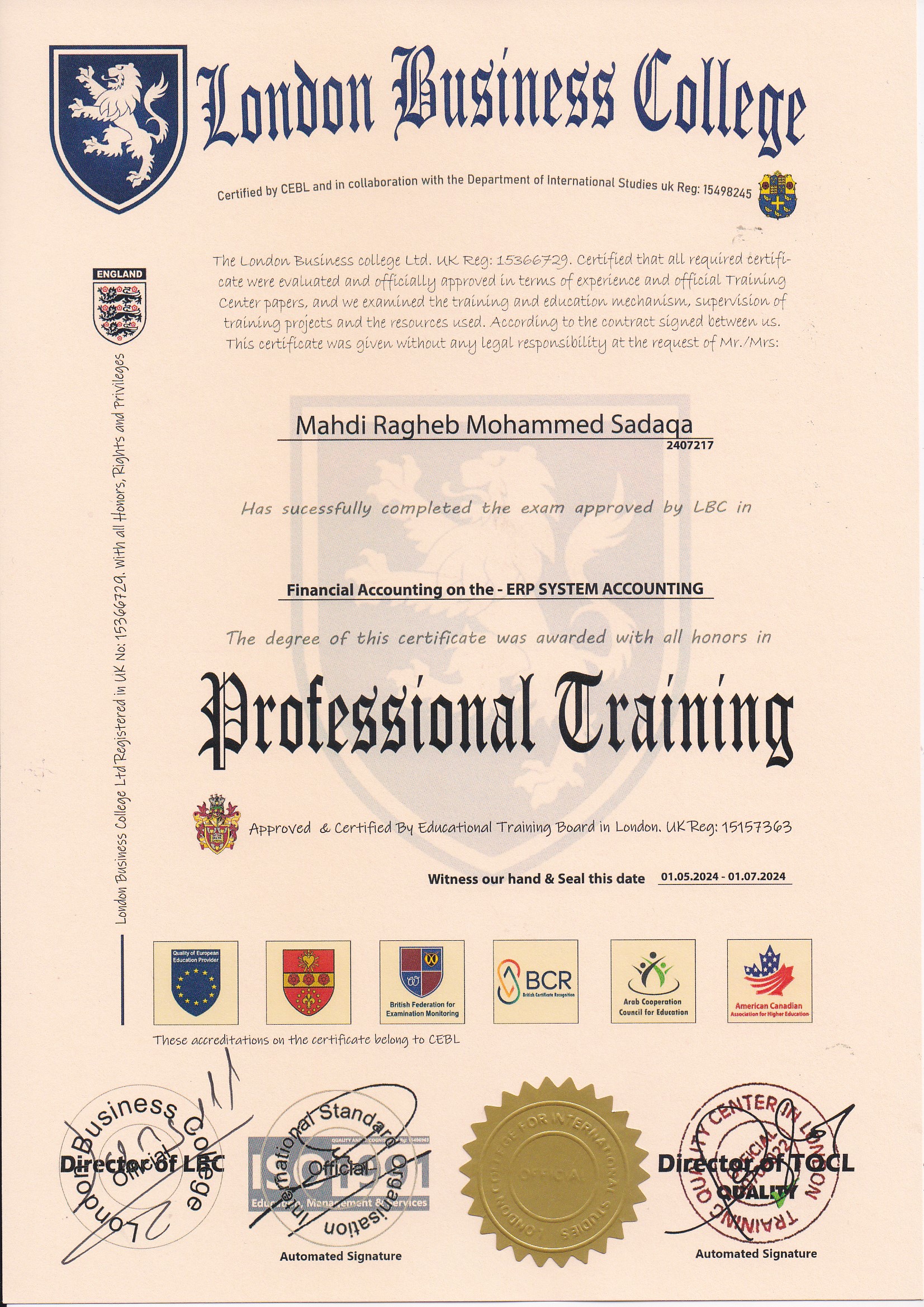 Approved by (Training Quality Center in London)