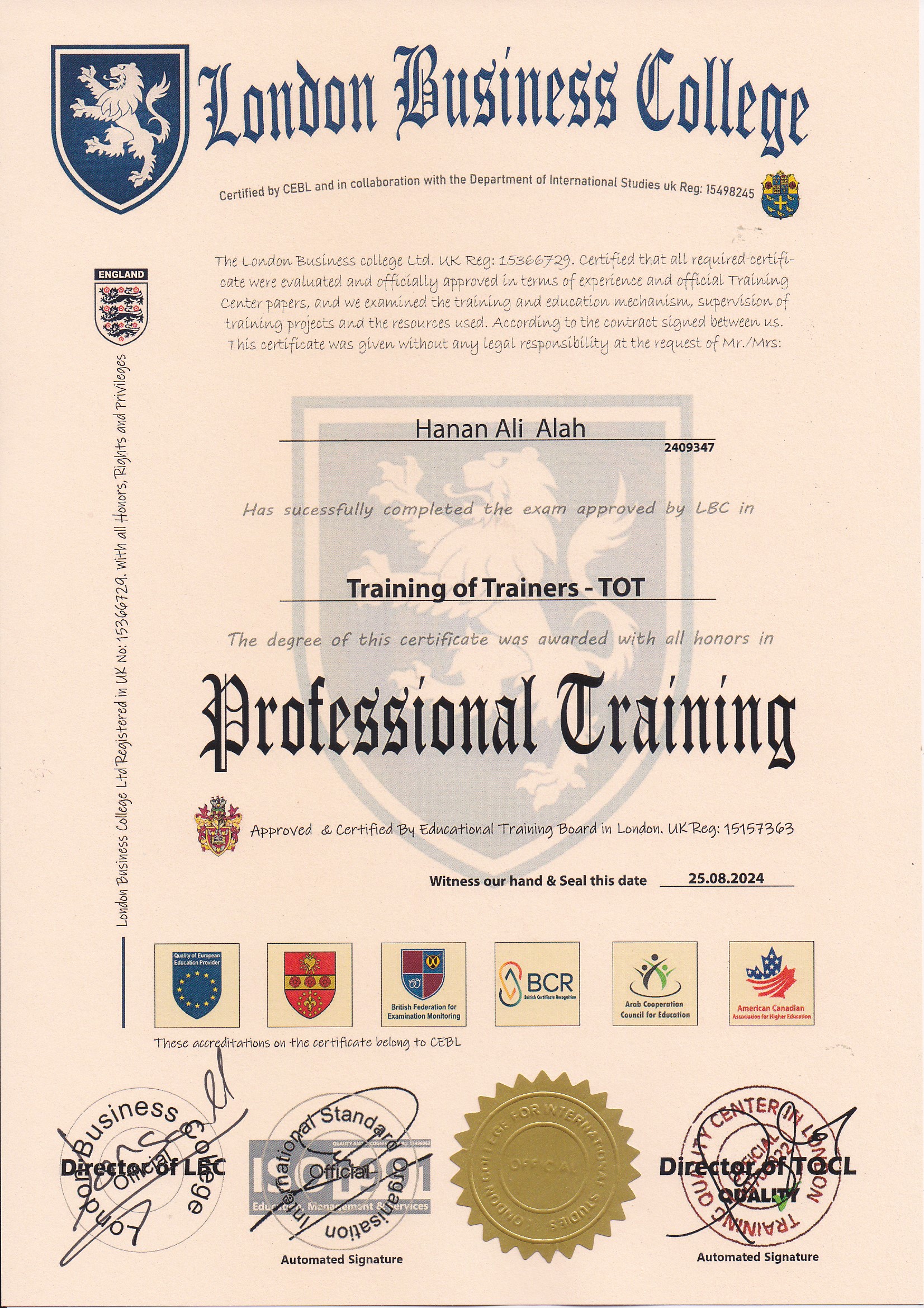 Approved by (Training Quality Center in London)