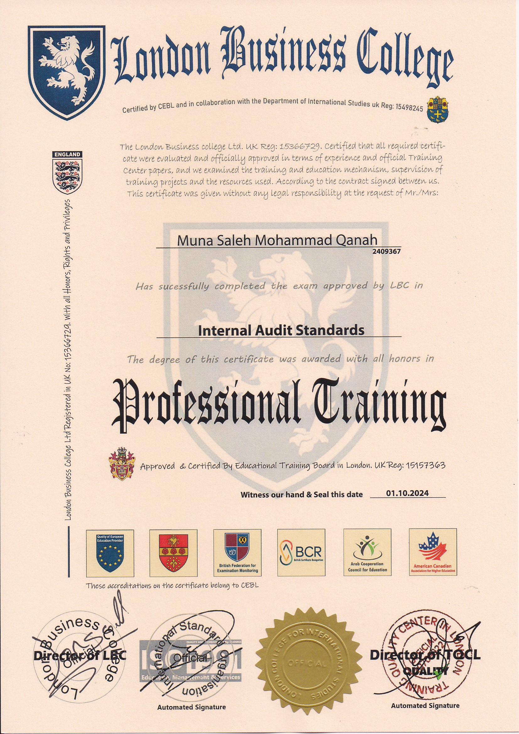Approved by (Training Quality Center in London)