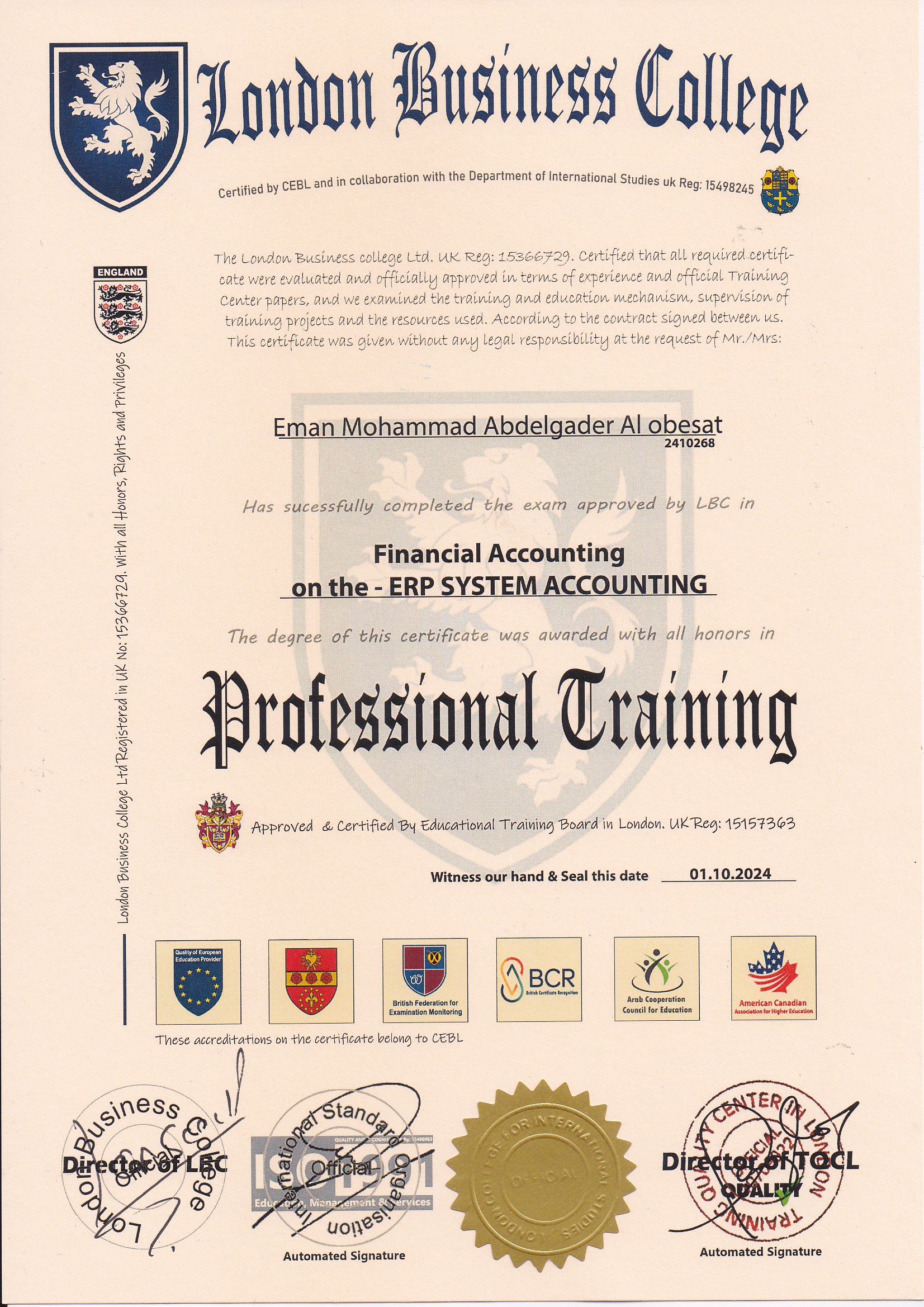 Approved by (Training Quality Center in London)