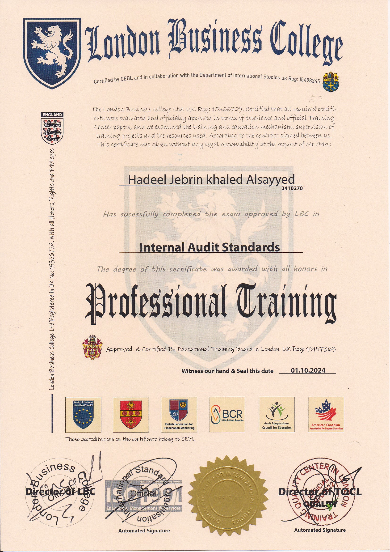 Approved by (Training Quality Center in London)