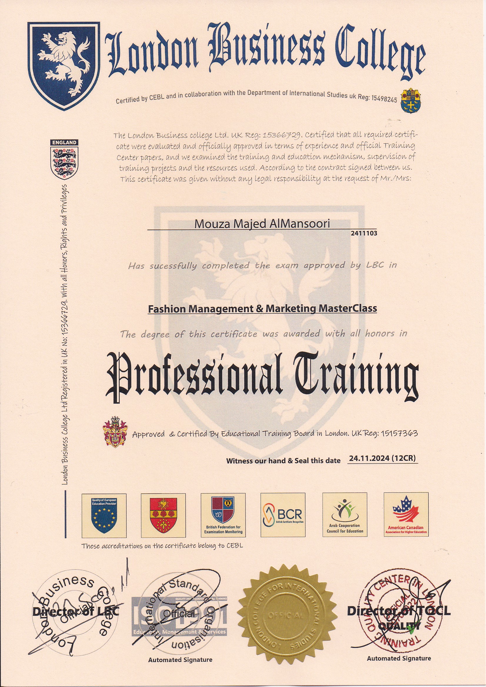 Approved by (Training Quality Center in London)