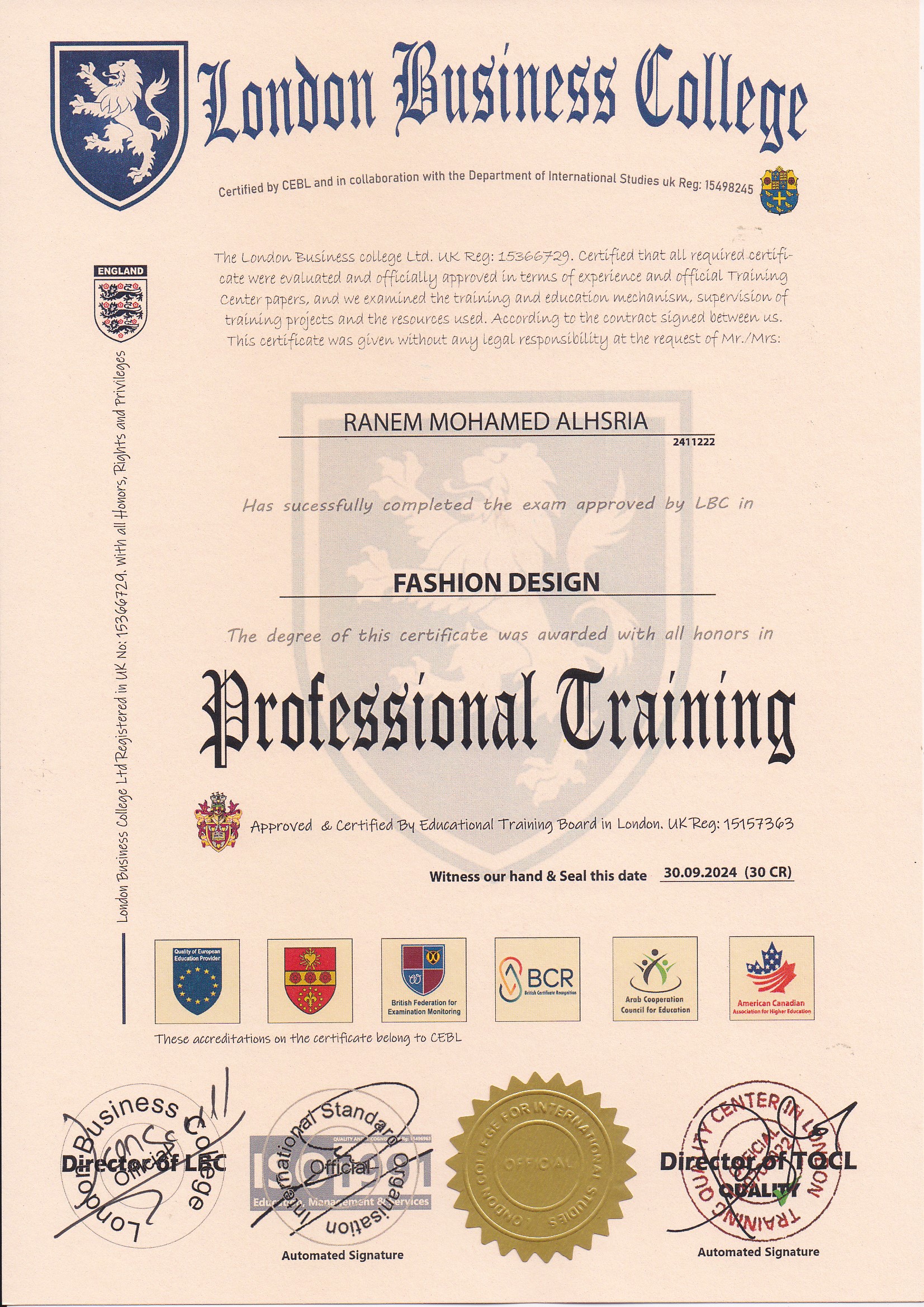 Approved by (Training Quality Center in London)