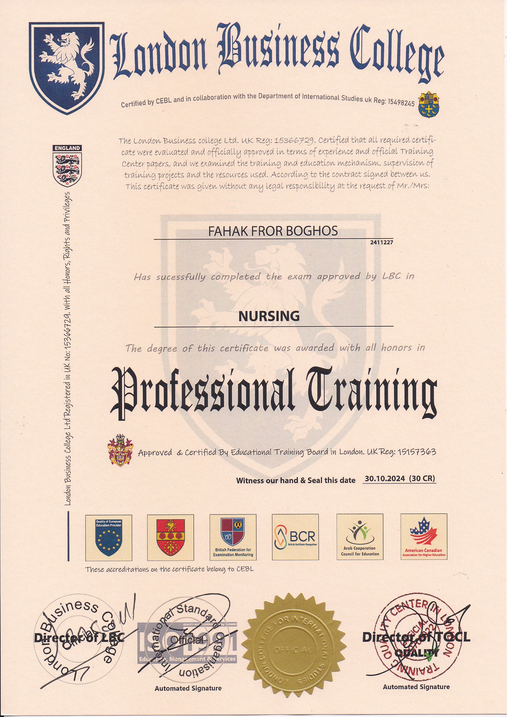Approved by (Training Quality Center in London)