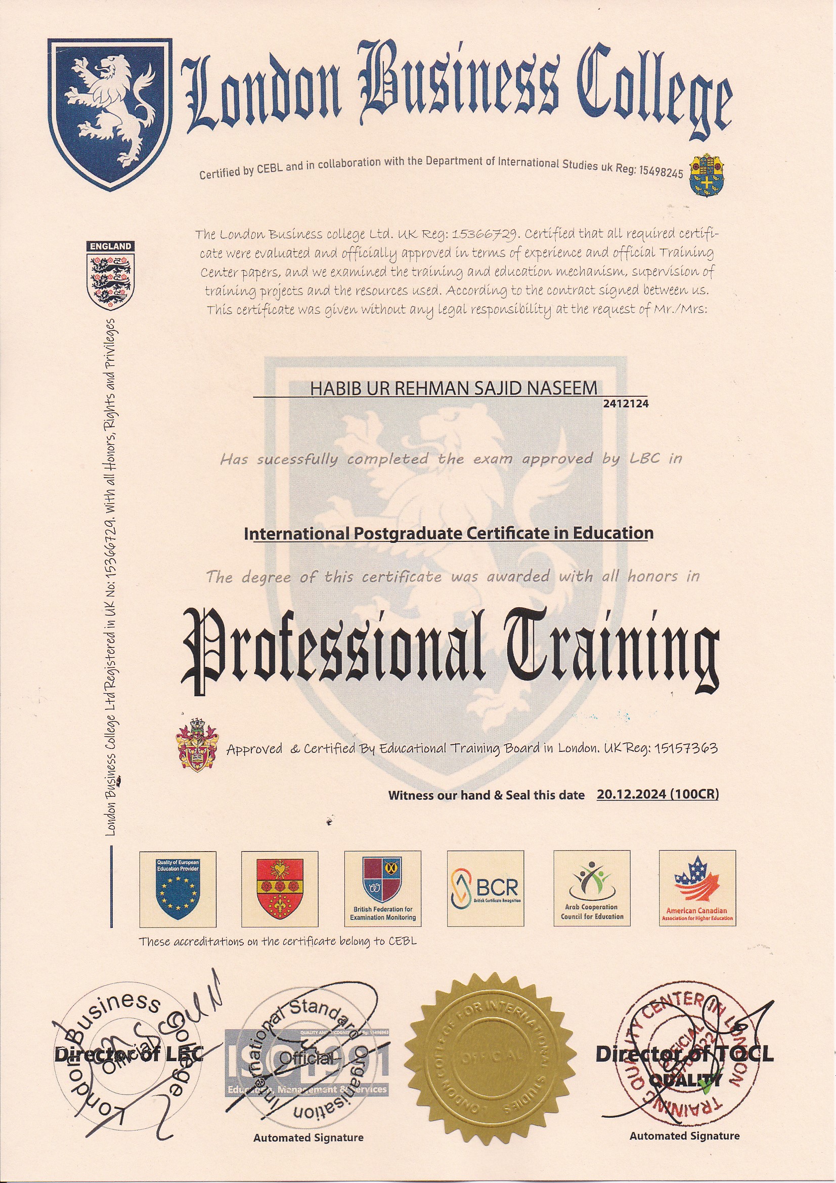 Approved by (Training Quality Center in London)